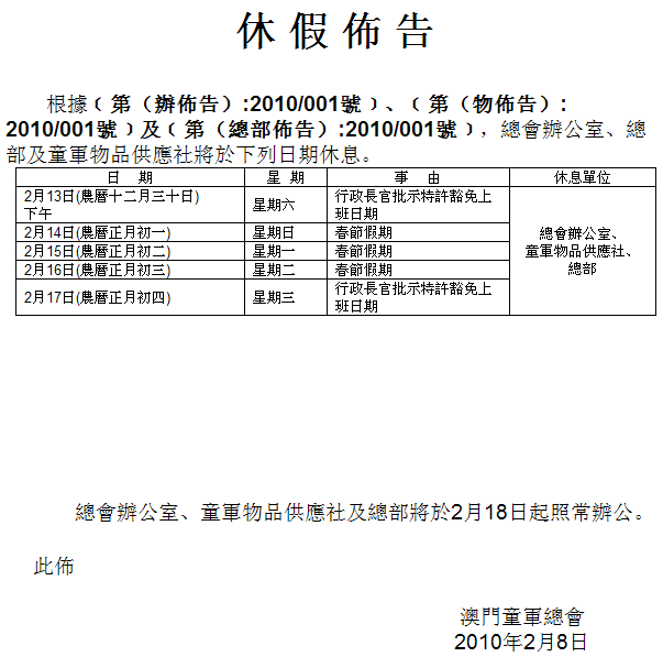 童軍總會新春休假佈告