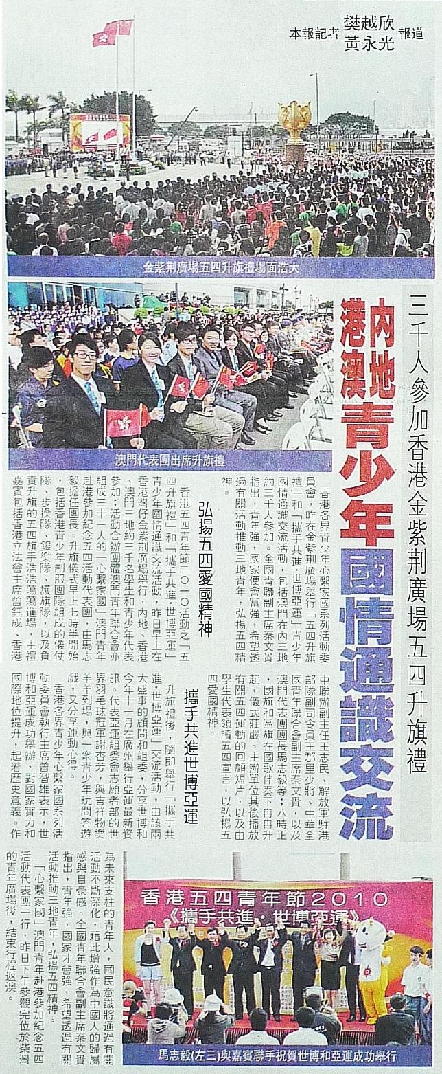 由澳門青年聯合會組織“心繫家國”澳門青年赴港參加紀念五四活動代表團,已於日前順利完成。首先感謝 貴會及 閣下對是次活動所提供協助及支持。另外,是次活動亦得到澳門日報廣泛報導,現附上相關報導,以供查閱。再次衷心感謝!