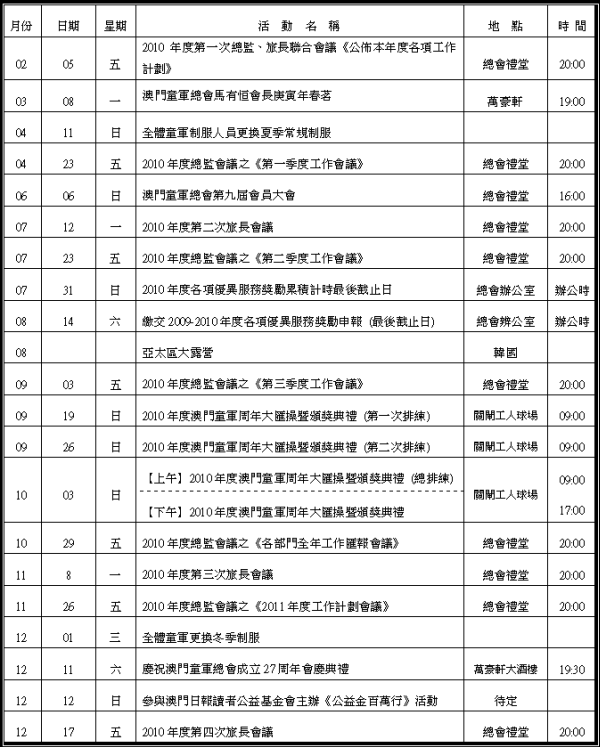 澳門童軍總會2010年度總會各項會議、大型活動行事曆簡介