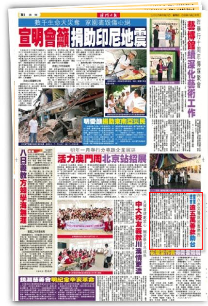 自台灣八.八水災發生後,本澳社會各界秉持一方有難、八方支持的信念,紛紛以不同形式舉辦賑災籌款活動。澳門童軍總會為響應台灣童軍總會對八.八水災救災工作的號召,月前特別成立了“關懷台灣八.八水災、童軍廿元捐款運動”籌款工作委員會,並展開系列賑災籌款活動,發動屬下會員、家長、各旅部成員及親友參與這項有意義的善舉,活動反應非常踴躍,在全體成員的共同努力下,共籌得善款澳門幣五萬五干四百四十一元。而善款稍後將送交台灣童軍總會轉送災區,幫助災區學童重建生活信心。