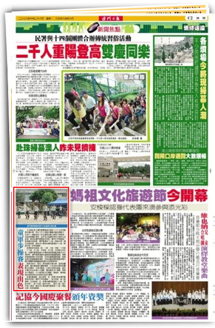 【本報消息】澳門童軍總會主辦的二○○九年度童軍步操比賽,昨日下午三時假中葡職中籃球場舉行,共有十一個旅部近三百名童軍參賽以角逐不同奬項。各旅部憑藉紀律性、合作性及協調性等各方面的出色表現,最後由澳門童軍第卅四旅(澳門江門同鄉會)勇奪基本組冠軍,澳門童軍第十六旅(蔡高中學)獲花式組冠軍,最佳司令員則由澳門童軍第十六旅(蔡高中學)林紫婷奪得。